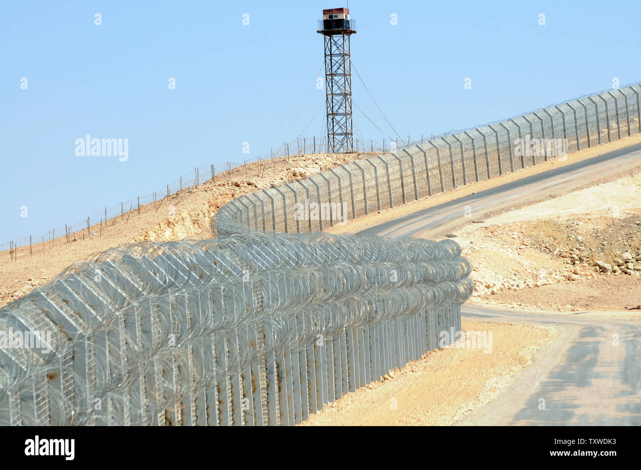 Post-upgrade section of fencing north of Eilat, 2012 Pre-upgrade Israeli border fence with Egypt near Nitzana, 2007 International Space Station satellite imagery of the border between Egypt (left) and Israel (right) with the Gaza Strip at its northern end The boundary between Egypt and Israel stretches 206 kilometers (128 miles) along the eastern edge of the Sinai Peninsula from the de facto tripoint with Palestine (Gaza) to the Gulf of Aqaba in the Red Sea